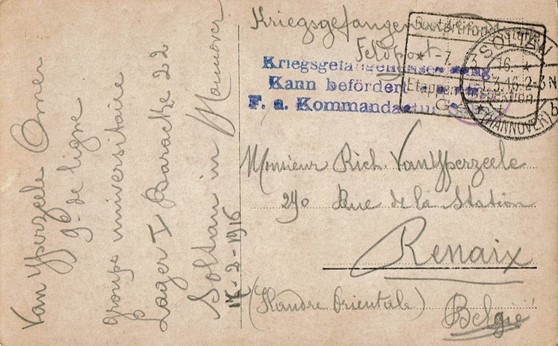 * Omer Vanyperzeele, °Ronse, 16.12.1890, zoon van Richard Vanyperzeele en Marie Vansaintmortier. Beroep: bediende: (1921). Adres: Ronse, Grote Markt (1921). In 1916 zat hij gevangen in Soltau (stempel van kaart). Edgard Cambier vermeldt hem in zijn dagboek eerst als vermist daarna als gevangengenomen.