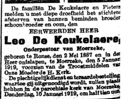 Zijn broer Leo De Keukelaere, °Ronse, 2.5.1887 en +Moerzeke, 5.1.1919, was onderpastoor in Moerzeke.